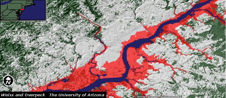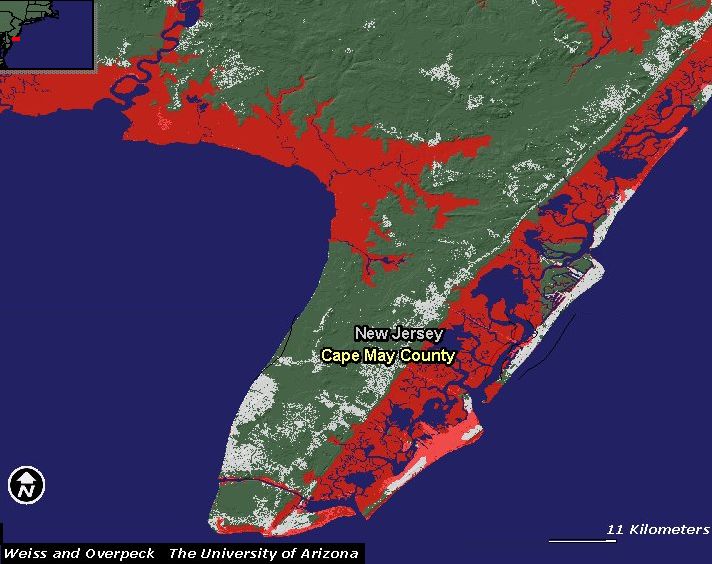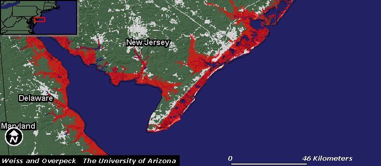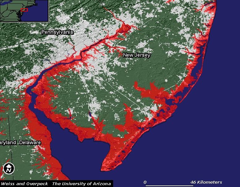 The Department of Geosciences at the University of Arizona has set up an interesting simulation of coastlines depending on how much the sea levels rise. Using that, I made some maps of the area I live in--i.e. the Delaware Valley--of what the coastline would look like if the levels rose: at best 1 meter, worse 6 meters. The worst is if one of the Antarctic shelves were to melt, but I don't know how likely that actually is.